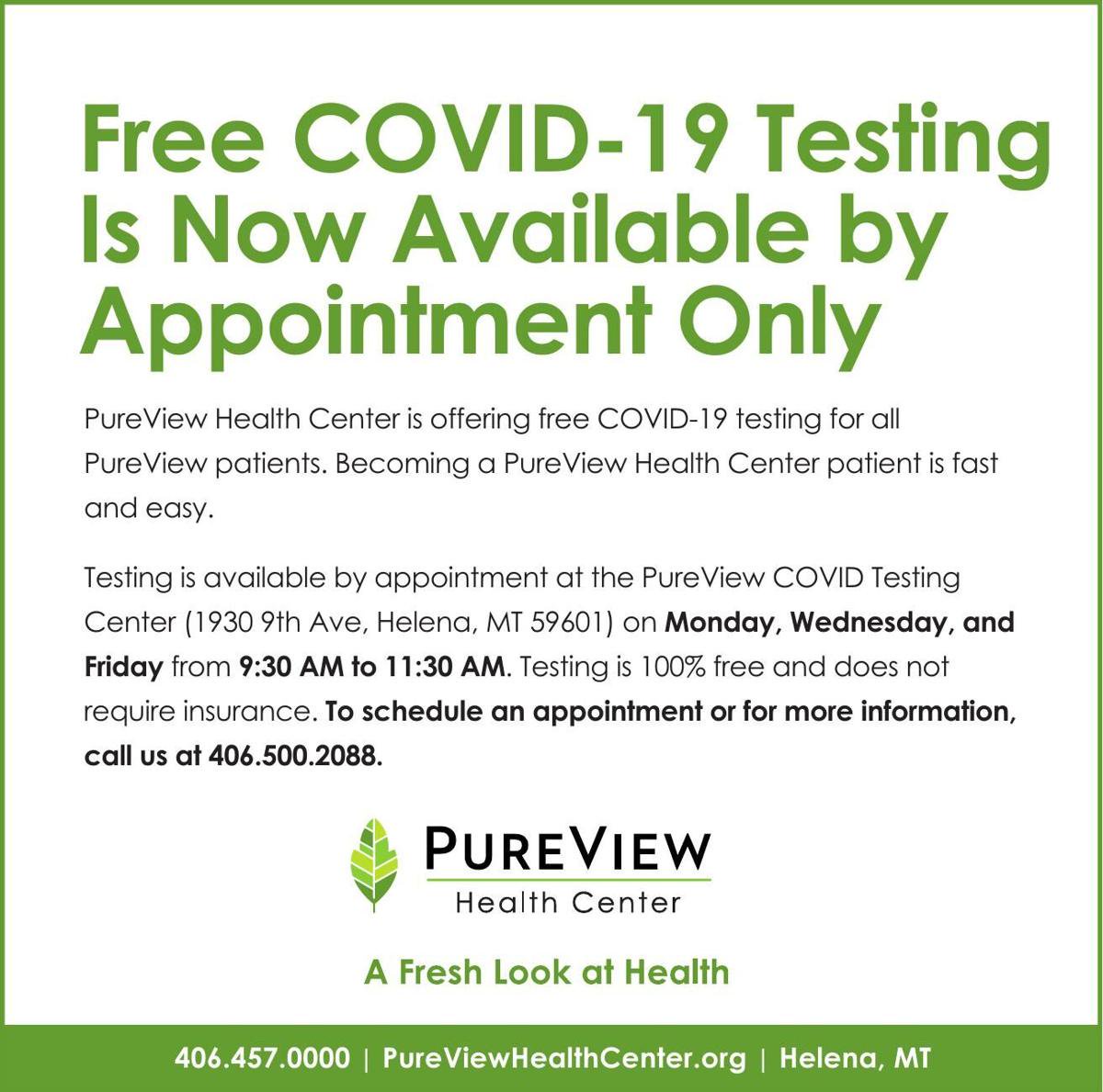 Menu Reservations Make Reservations. PureView Health Center in Helena will offer free COVID-19 testing for asymptomatic people the next two Saturdays as part of surveillance testing for the virus.