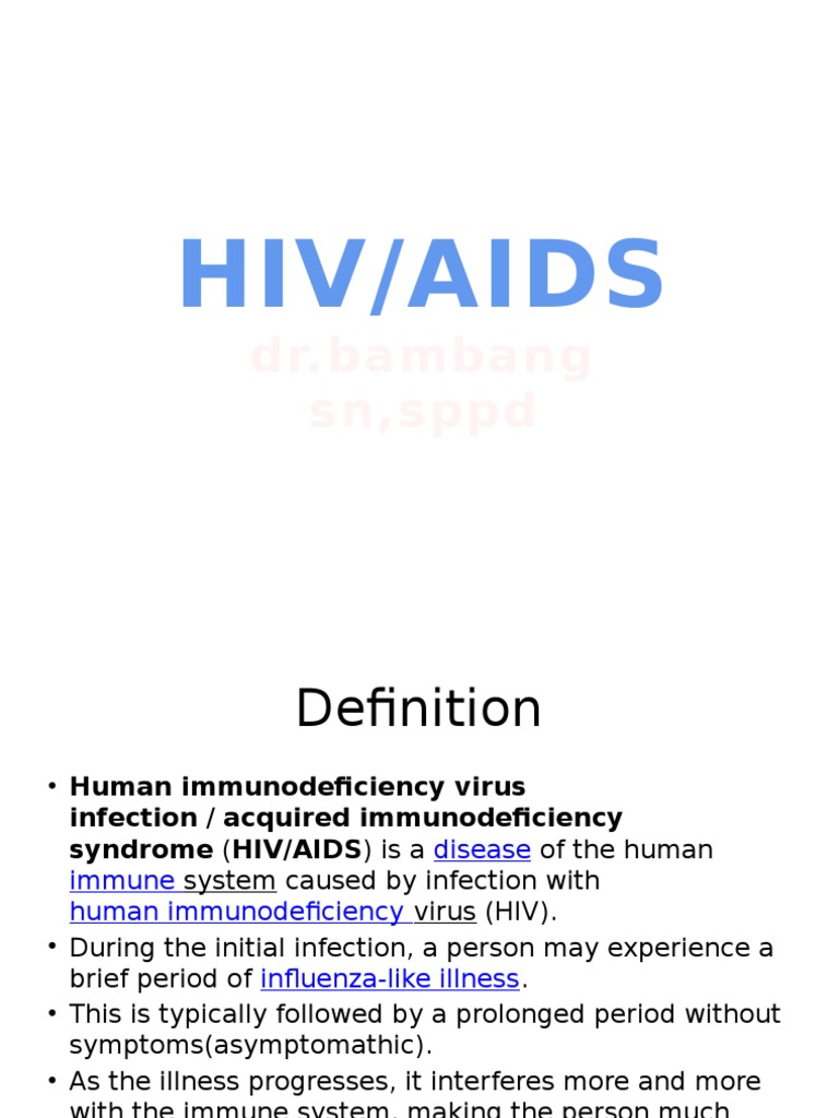 AIDS is a condition in humans in which progressive failure of the immune system allows life-threatening. HIV human immunodeficiency virus is a virus that damages the cells in your immune system and weakens your ability to fight everyday infections and disease. A person with HIV is considered to have progressed to AIDS when.